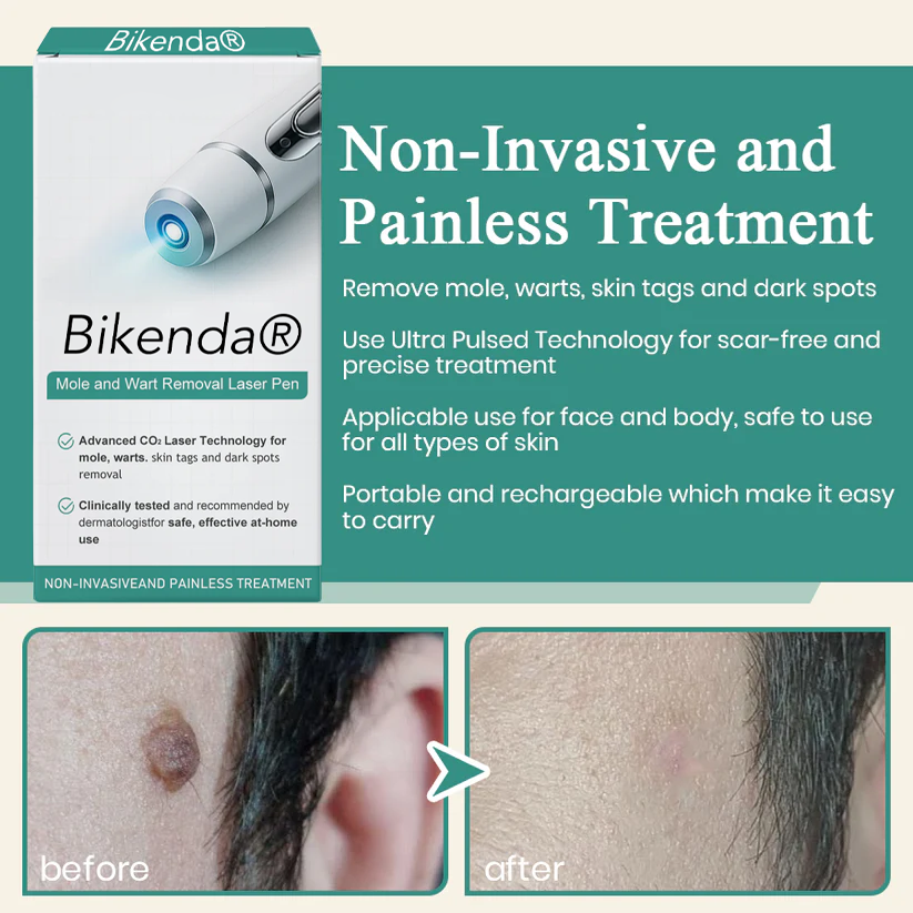 • Skip the costly dermatology visits, painful surgeries, and ineffective topical creams. The Bikenda® Mole and Wart Removal Laser Pen offers a safe, non-invasive, and clinically effective solution for use in the comfort of your own home. Powered by advanced CO₂ laser precision, it targets moles, warts, skin tags, dark spots, and other blemishes without causing cuts, burns, or irritation. Its approved ultra-pulsed mode ensures precise, layer-by-layer removal to reduce the risk of scarring while supporting natural healing and skin renewal.