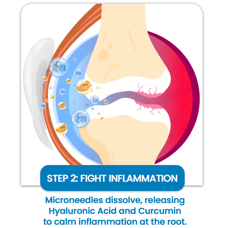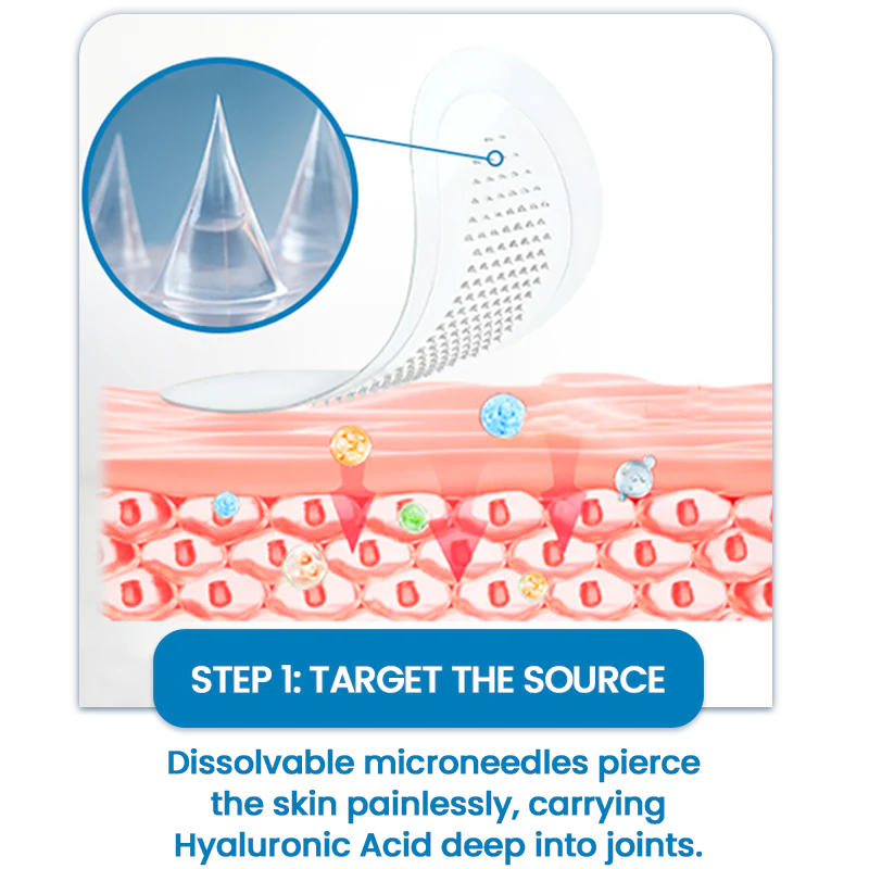 Each patch is infused with ultra-fine 0.27mm micro-pins—thinner than a hair—made from dissolvable plant-based ingredients. These microneedles gently enter the skin's surface, delivering natural joint-soothing compounds deep into the affected area—no pills, no pain, just real relief where it matters.