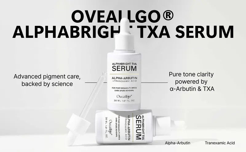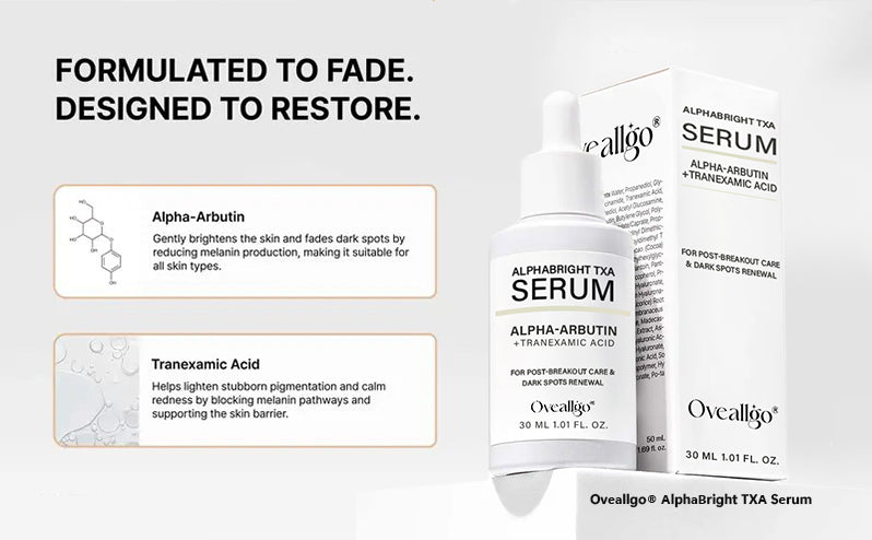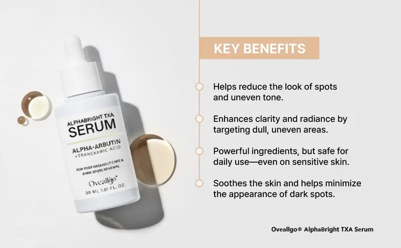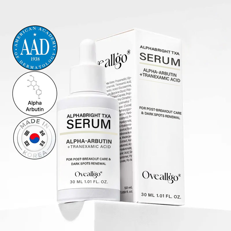 Oveallgo® AlphaBright TXA Serum For Post-Breakout Care & Dark Spots Renewal powered by our advanced AlphaBright TXA+ Renewal Complex—featuring Tranexamic Acid (TXA), Niacinamide, and Hyaluronic Acid (HA)—clinically designed to fade post-inflammatory hyperpigmentation, calm redness, and boost hydration with every application.