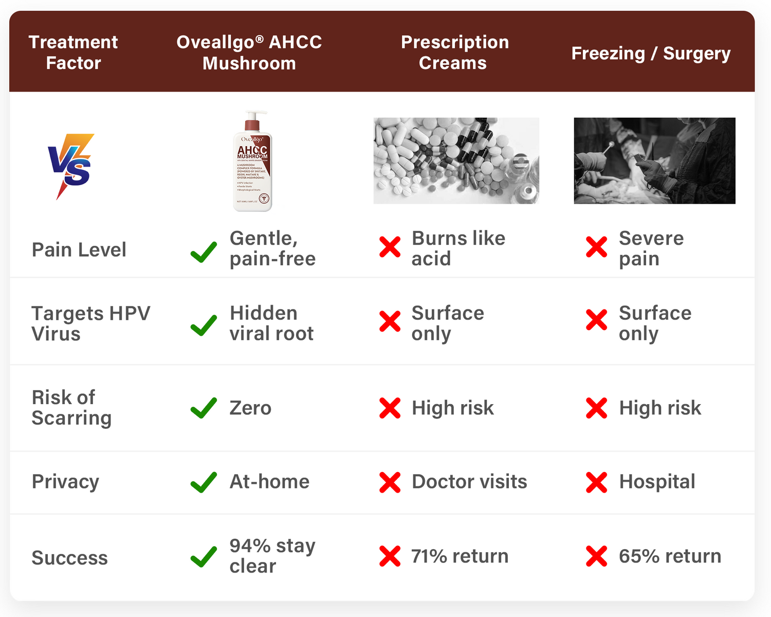 A: Other treatments only remove surface warts. The 4-mushroom AHCC complex targets the viral root AND strengthens immunity. 94% stay clear after 6+ months vs. 71% recurrence with prescription creams.